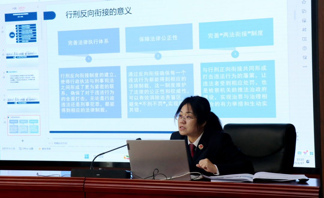 节前,阳原县检察院常态化开展“泥河检韵”专题培训,第二检察部检察官李晓霞以“如何规范办理行刑反向衔接案件”为题与干警们进行交流学习。